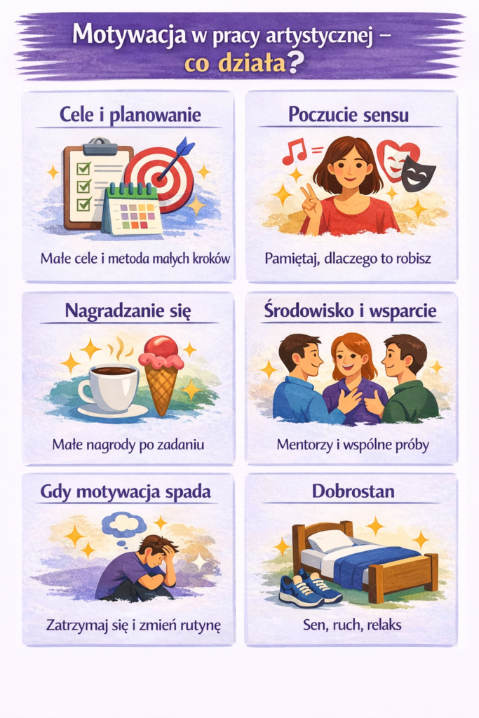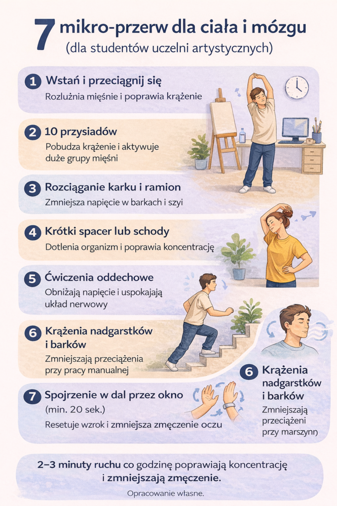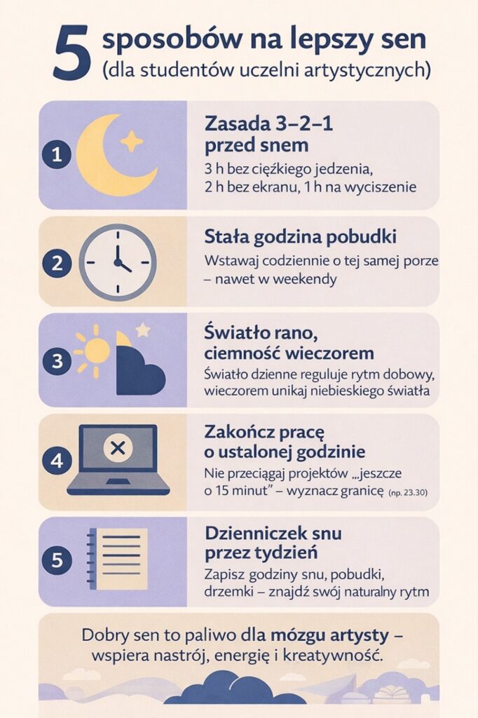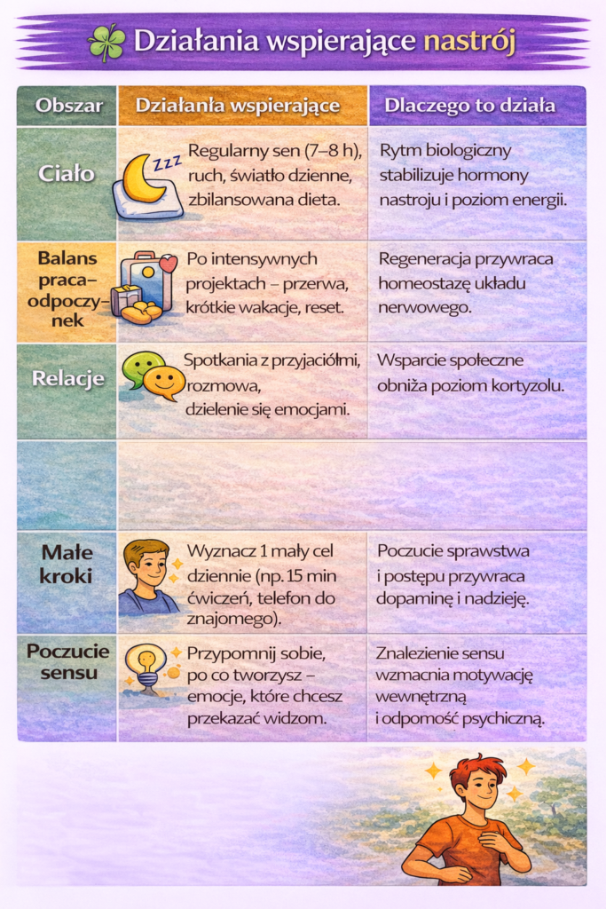 Zachęcamy do traktowania tych materiałów nie jako zbioru obowiązkowych zasad, lecz jako przewodnika po sposobach dbania o własną energię psychiczną, koncentrację i równowagę. Nawet niewielkie zmiany w codziennych nawykach mogą znacząco poprawić samopoczucie, ułatwić radzenie sobie ze stresem i stworzyć lepsze warunki do rozwijania kreatywności.