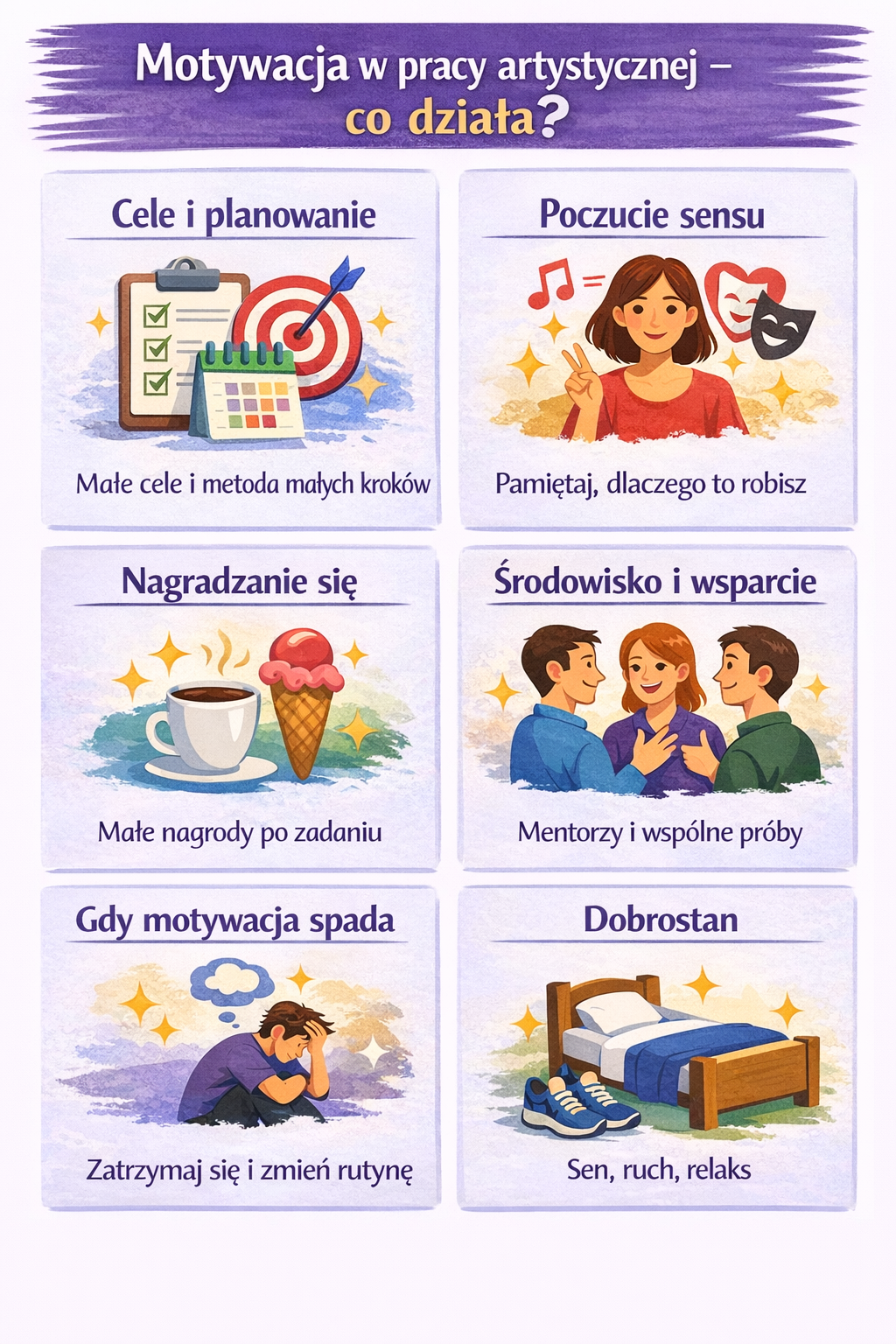 - Gdy motywacja spada: zatrzymaj się i zidentyfikuj źródło problemu (zmęczenie, stres, brak wiary w siebie), zmień rutynę (np. krótsze sesje, nowy repertuar), poszukaj wsparcia (pedagog, psycholog, duet z kolegą).